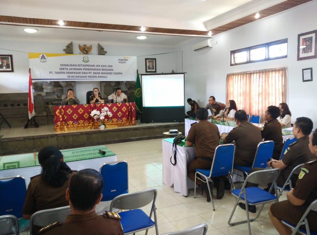 Selasa 21 Mei 2019 bertempat di Aula Kejaksaan Negeri Bangli, telah dilaksanakan "Sosialisasi Ketaspenan JKK dan JKM serta layanan perbankan bersama PT. Taspen Denpasar dan PT. Bank Mandiri Taspen (Mantap) di Kejaksaan Negeri Bangli".